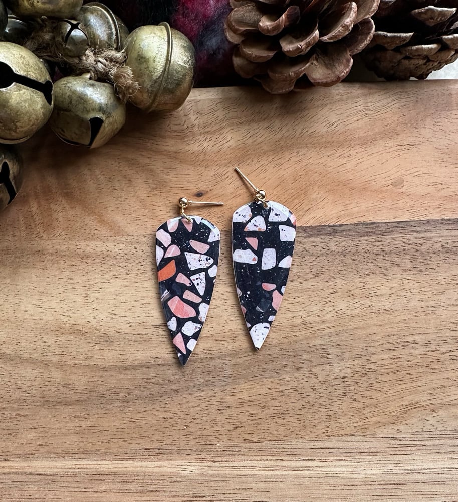 Black neutrals terrazzo. Measures 2” long x 0.75” wide.