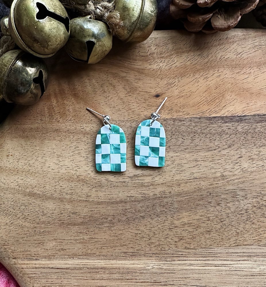 Marbled green + sparkly white checkered pattern. Measures 1” long x 0.5” wide.