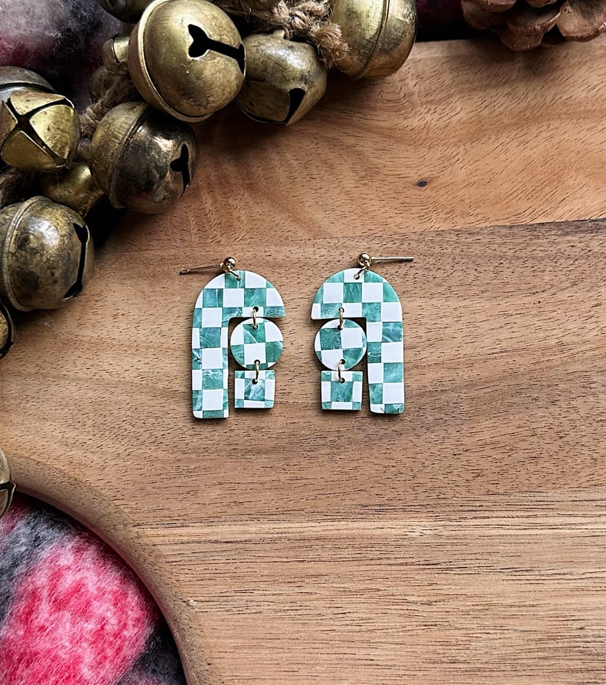 Marbled green + sparkly white checkered pattern. Measures 1.5” long x 1” wide.