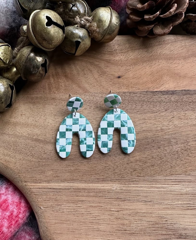 Marbled green + sparkly white checker pattern. Measures 2” long x 1.25” wide.