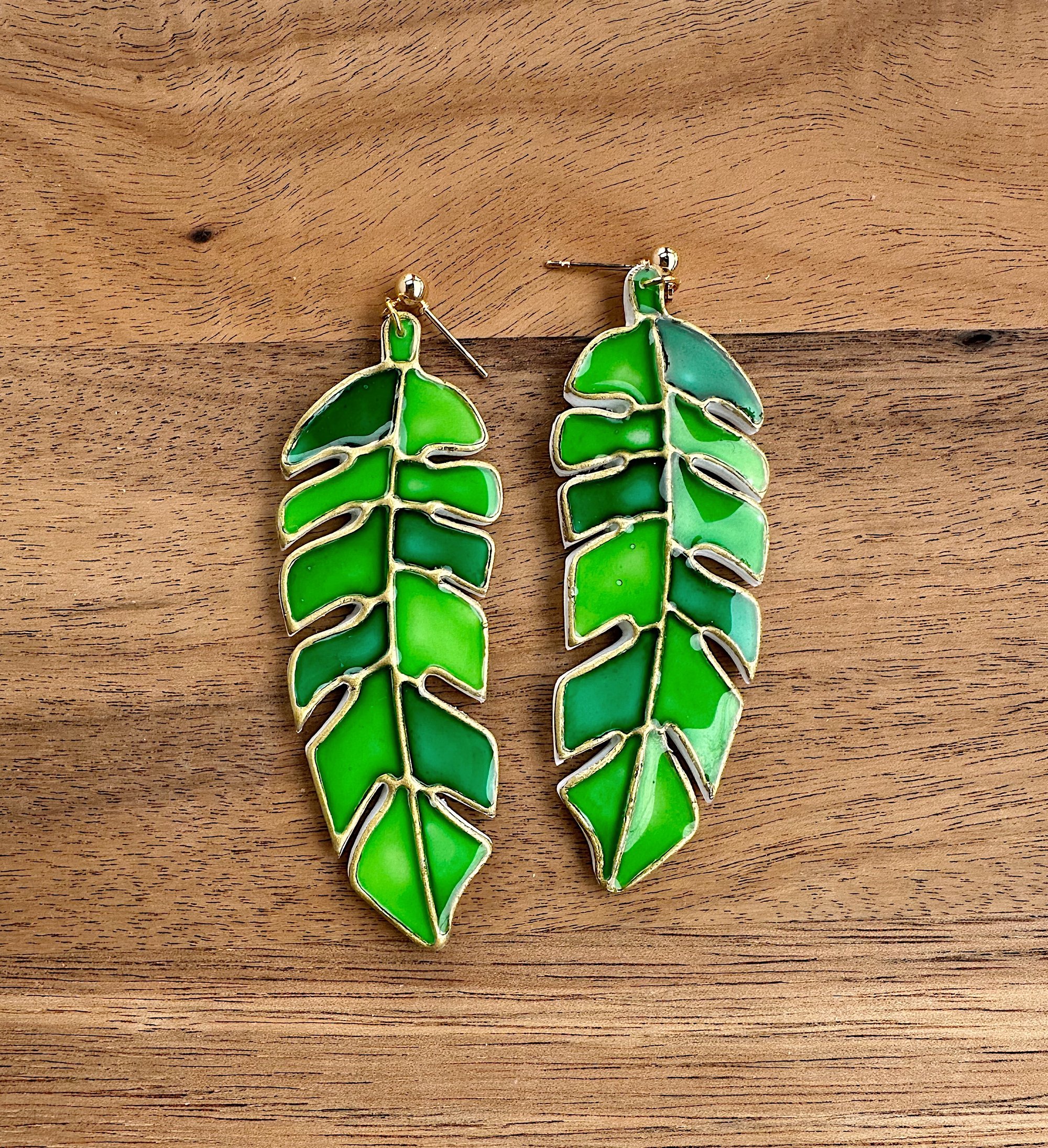 Banana leaf dangles in stained glass technique. Shades of green with gold accent. Measures 3" long x 1" wide.